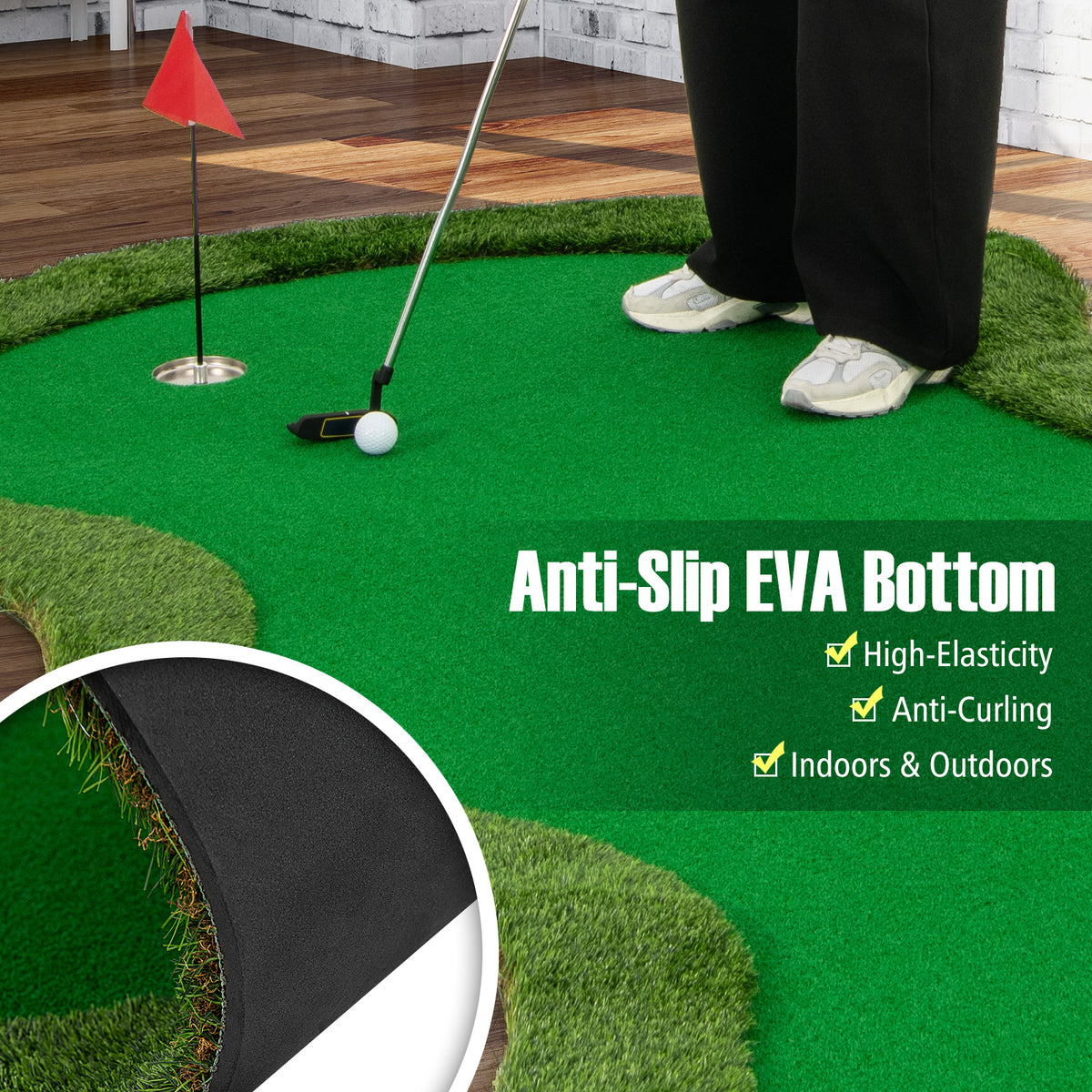 Can you skip the pricey golf course and instead practice your putting skills with this realistic golf putting green? Featuring three carefully designed holes complete with flags and cups, this putting green offers a variety of challenges to enhance your precision and accuracy. The vibrant green surface mimics the texture and feel of a real golf course, allowing you to get a true sense of the game. The non-slip backing keeps the mat securely in place, ensuring stability and preventing any unwanted movement during your practice sessions. It can also be rolled up and stored conveniently when not in use, making it perfect for both indoor and outdoor use.