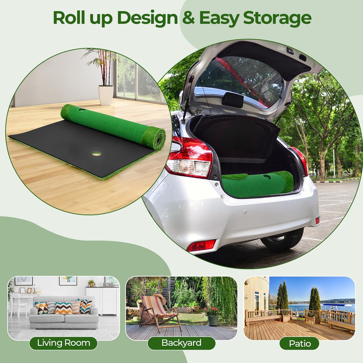 - Easy to Store & Carry: Effortlessly transport and store your putting green with its easy-to-fold design. Whether in the living room, office, patio, or backyard, this mat can be conveniently rolled up for compact storage or carry on, providing flexibility for practice sessions wherever you go.