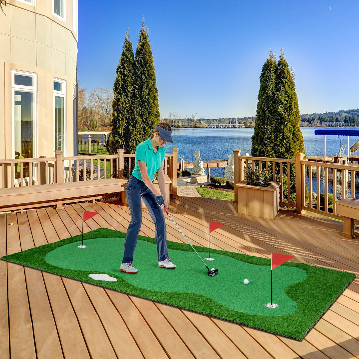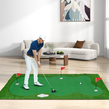Can you skip the pricey golf course and instead practice your putting skills with this realistic golf putting green? Featuring three carefully designed holes complete with flags and cups, this putting green offers a variety of challenges to enhance your precision and accuracy. The vibrant green surface mimics the texture and feel of a real golf course, allowing you to get a true sense of the game. The non-slip backing keeps the mat securely in place, ensuring stability and preventing any unwanted movement during your practice sessions. It can also be rolled up and stored conveniently when not in use, making it perfect for both indoor and outdoor use.
