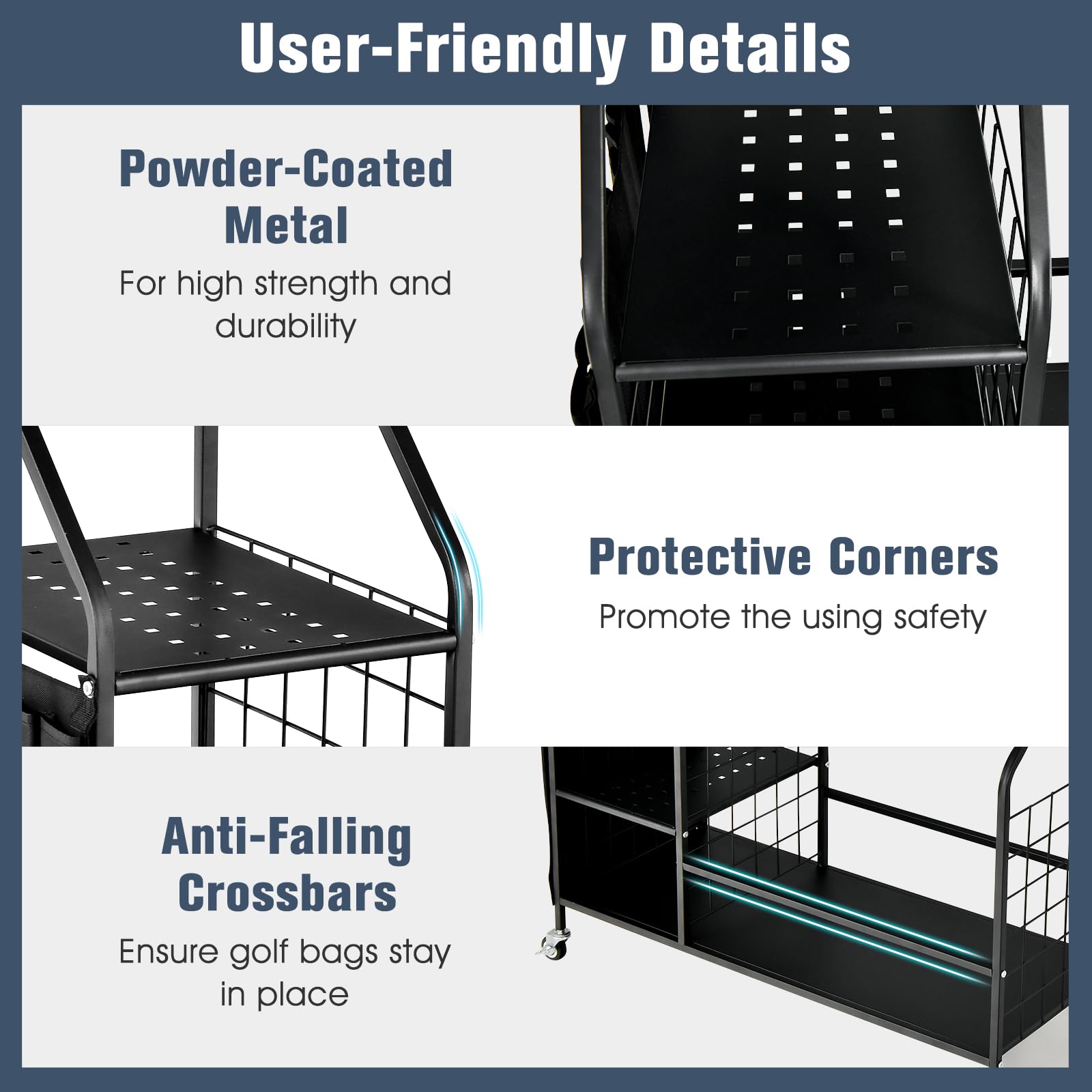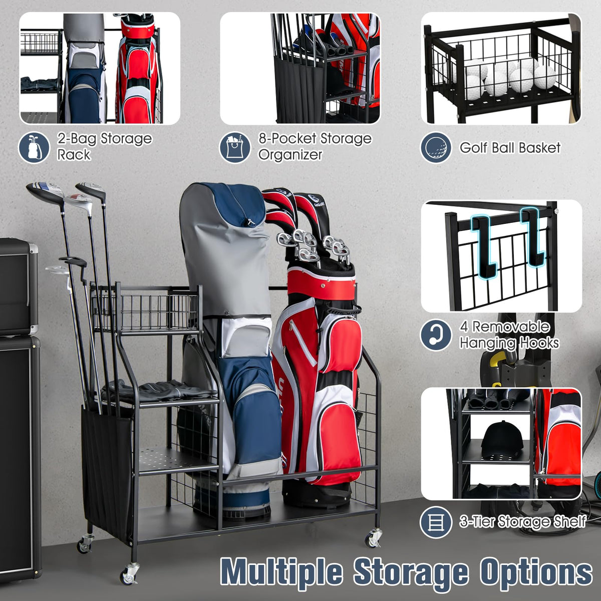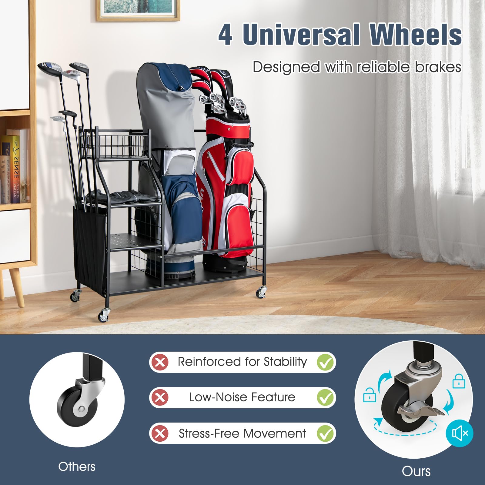 ULTIMATE 4-in-1 Golf Bag Storage Organizer with Lockable Wheels, 2 Golf Bags Storage Stand