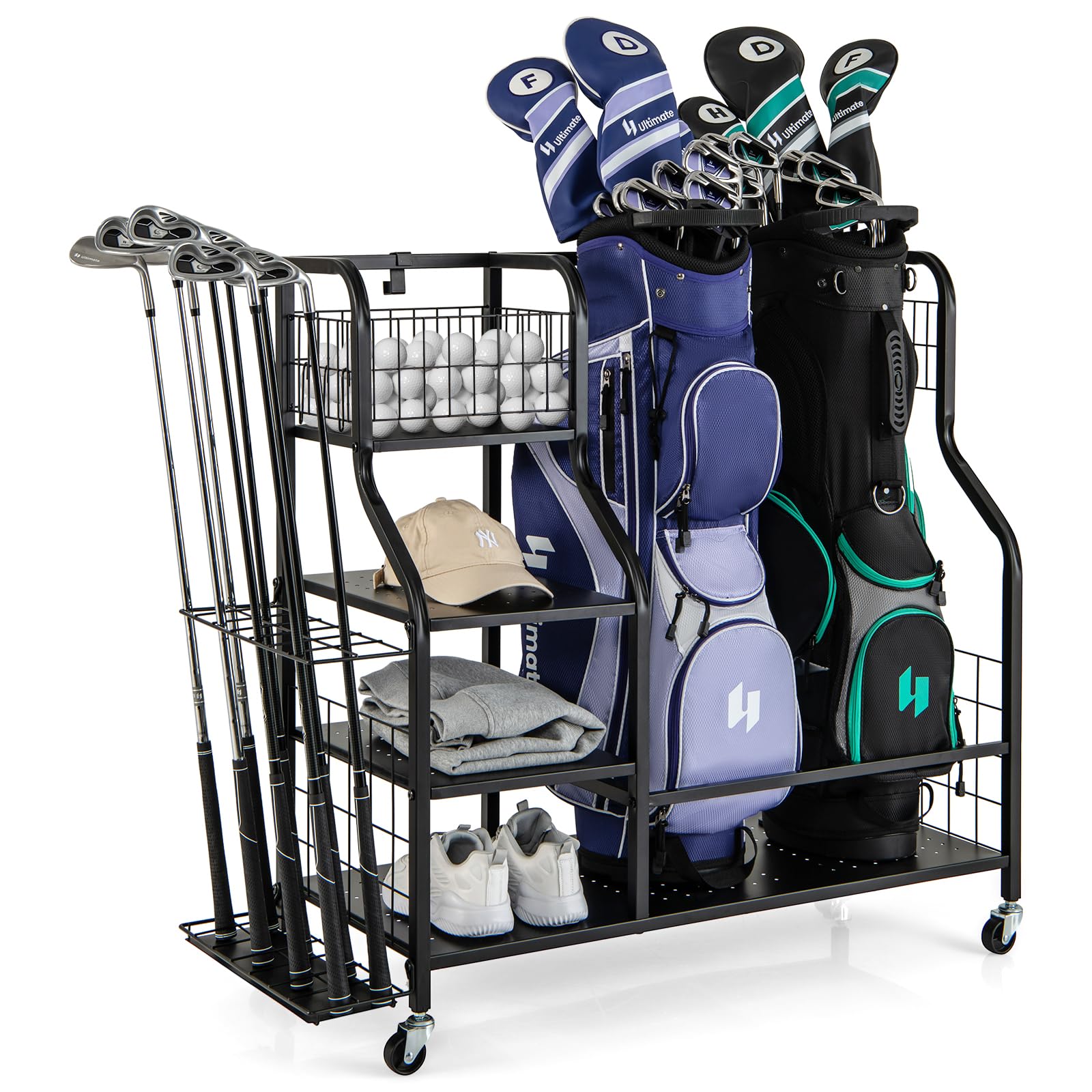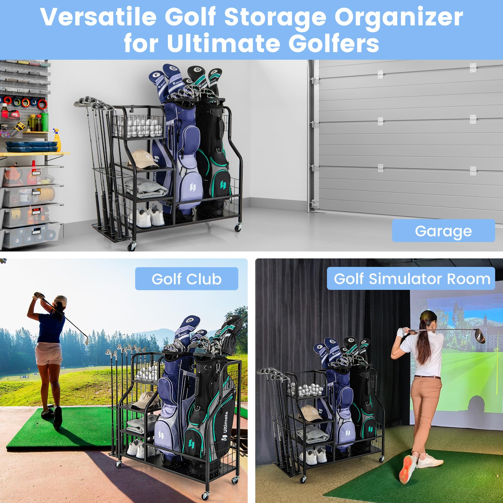 - Dual Golf Bag Capacity: The golf storage organizer features a robust golf bag stand that comes with anti-falling metal crossbars, comfortably holding 2 standard-size golf bags. It is a perfect choice for family use.