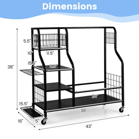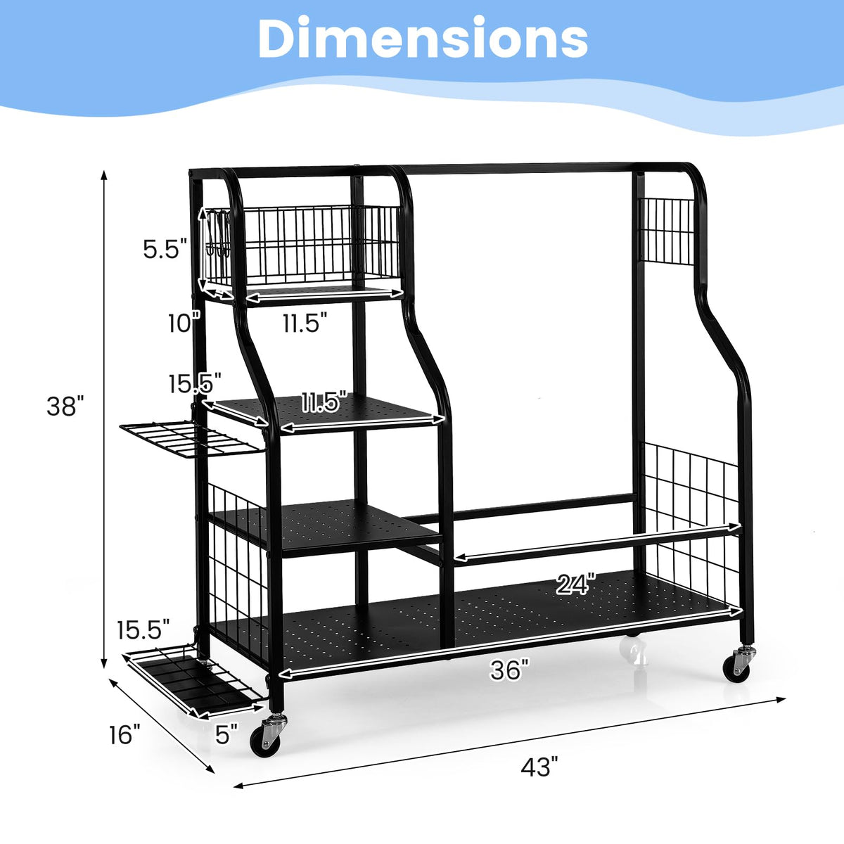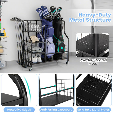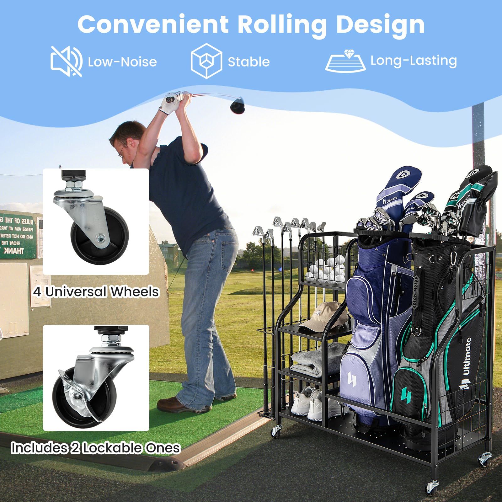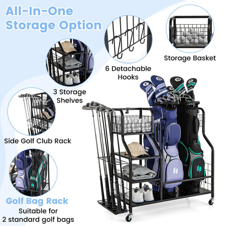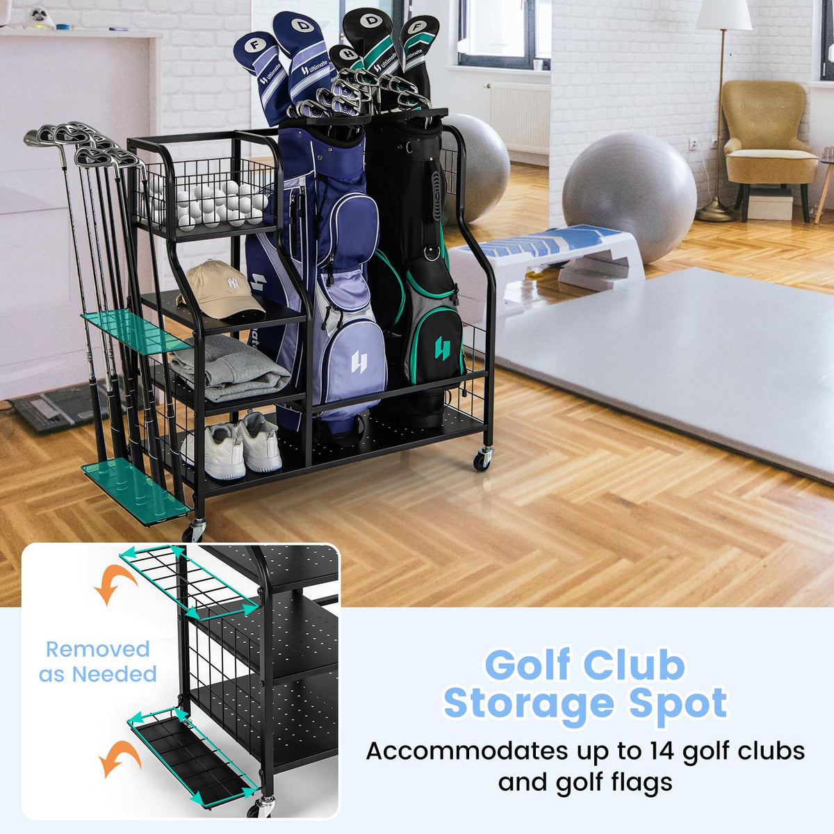 ULTIMATE 5-in-1 Golf Bag Storage Organizer, Rolling Golf Bag Stand with Storage Basket, 6 Removable Hooks