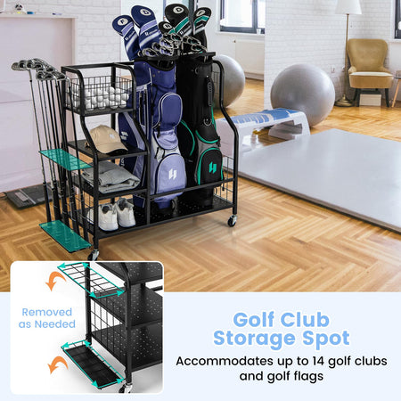 A multifunctional golf storage stand, capable of holding 2 golf bags securely with anti-falling metal crossbars. It offers additional storage solutions including a golf ball basket, 6 adjustable hooks, and 3 shelves for shoes and accessories. The detachable golf club rack features space for up to 14 clubs or flags, allowing for customization according to your needs. Crafted from powder-coated metal, this golf storage stand is robust enough to handle golf equipment. It boasts 4 smooth wheels for effortless mobility, including 2 lockable ones for stable stopping. This golf bag storage rack is an ideal solution for keeping all your golf gear neatly organized in one place.