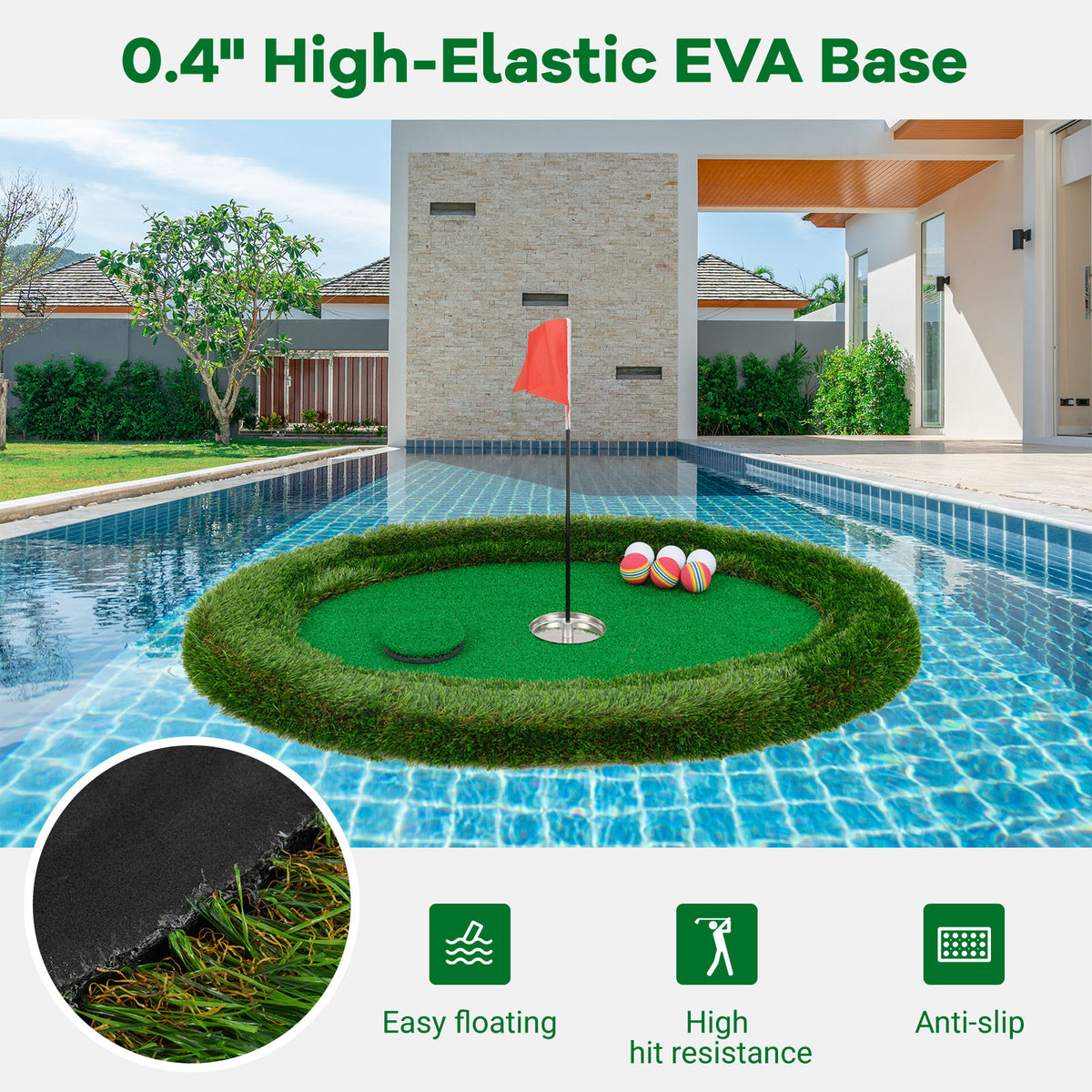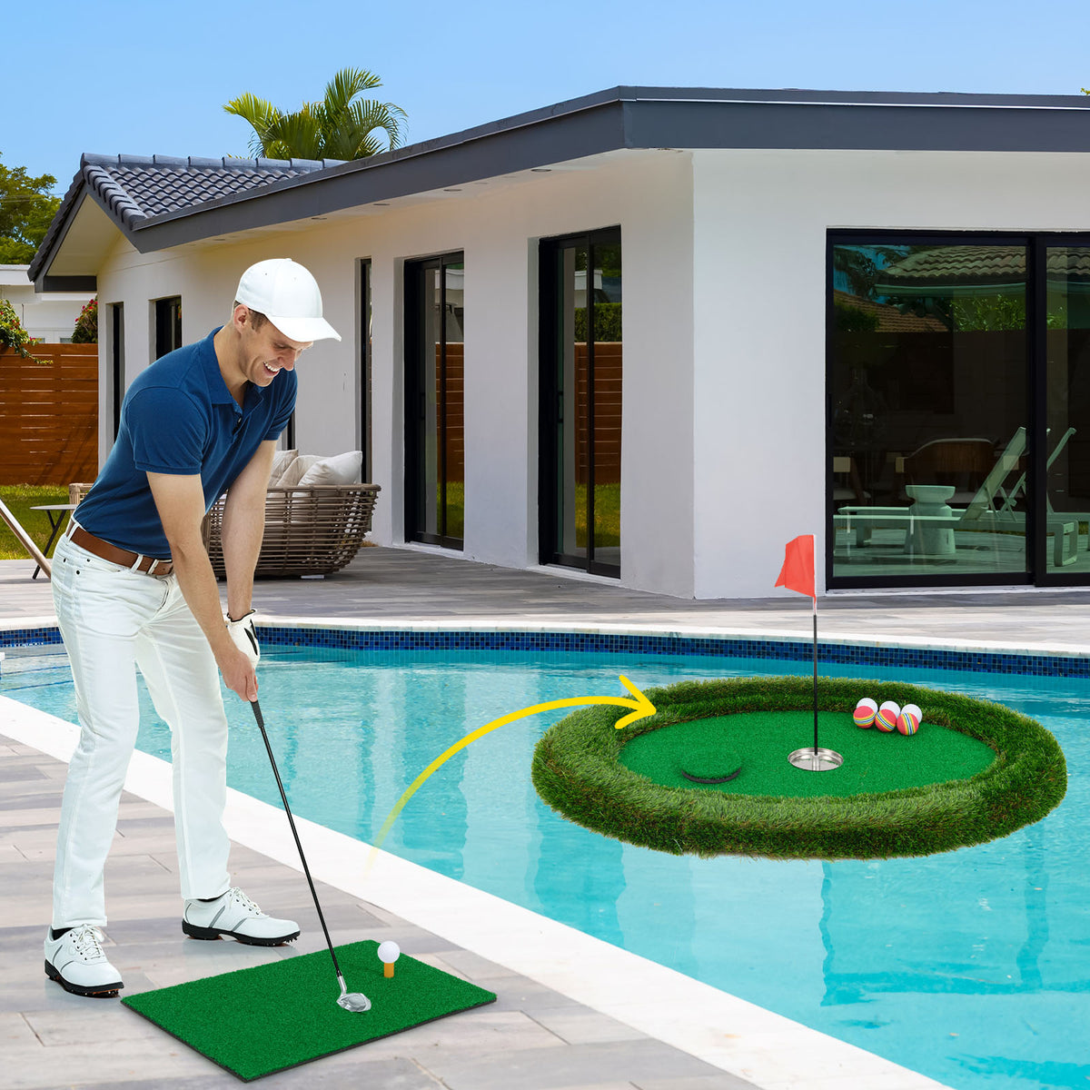 Enhance your golfing experience with this floating golf set. The realistic high-density grass turf ensures a genuine feel, while the high-elastic EVA base provides easy floating and durability. Perfect for various outdoor settings, this portable set adds fun to pools, lakes, and more. Ideal for both entertainment and practice, it makes a great gift for golf enthusiasts, with customizable scoring rules and the option for two-player competition. Join the fun and take your golf game to the water with this unique and exciting set.