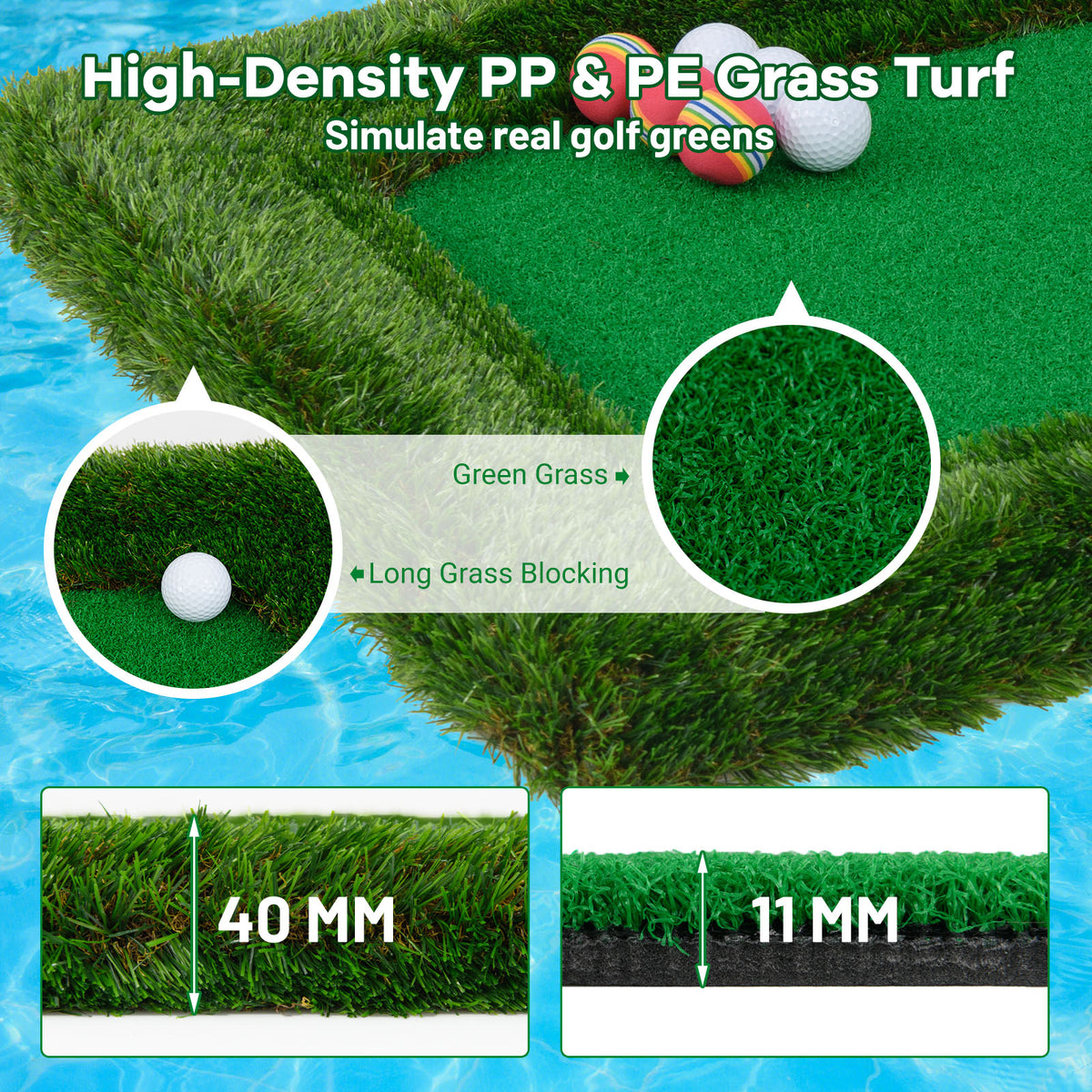 - Simulate Real Golf Greens: The high-density PP and PE grass turf offers a realistic feel of hitting and can withstand long-time use. Designed with long grass blocking, the floating mat effectively prevent the ball from rolling out of the pool golf green.