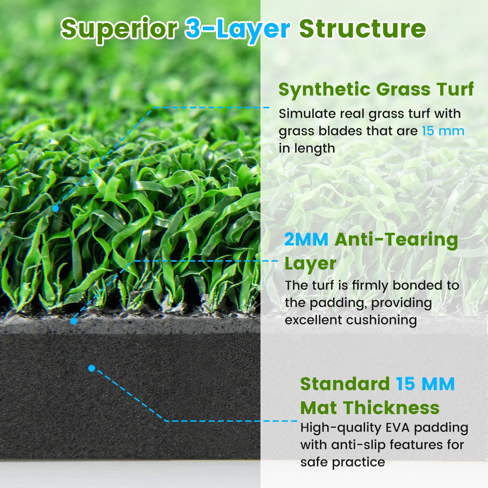 - ⛳【Excellent Shock Absorption】⛳Featuring 15 mm EVA non-slip foam padding, our golf hitting mat ensures excellent shock absorption to protect your clubs and wrists. Plus, the turf and padding are securely joined, providing great cushioning and durability.