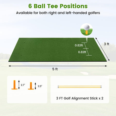 - ⛳【6 Ball Tee Positions】⛳The 5 ft x 3 ft golf training turf mat provides plenty of room for practice and includes 6 ball tee positions to cater to both right and left-handed golfers. The included rubber tees also offer added convenience during practice sessions (Ball tee can be installed).