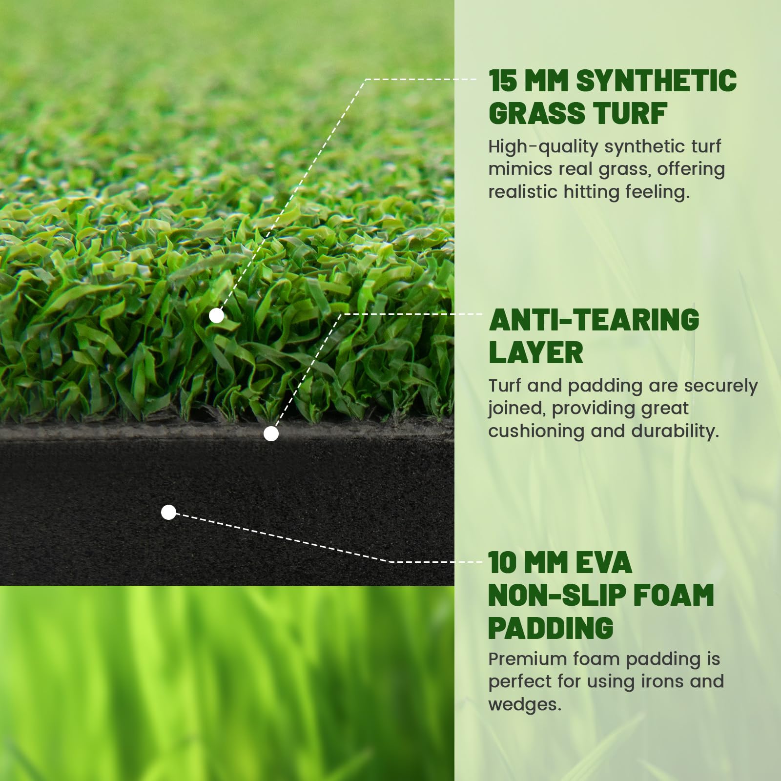 - ⛳【Excellent Shock Absorption】⛳Featuring 10 mm EVA non-slip foam padding, our golf hitting mat ensures excellent shock absorption to protect your clubs and wrists. Plus, the turf and padding are securely joined, providing great cushioning and durability.