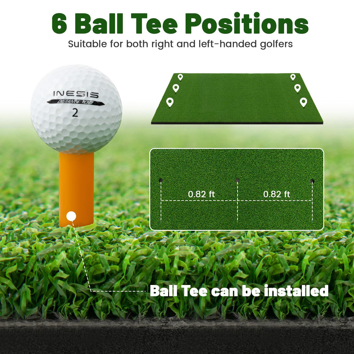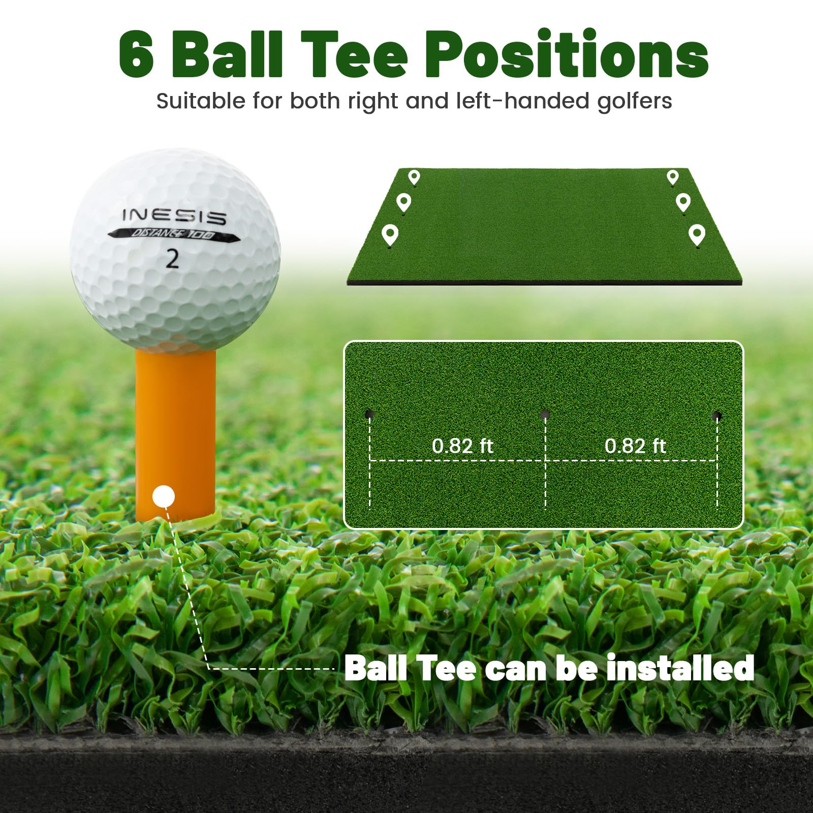 - ⛳【6 Ball Tee Positions】⛳The 5 ft x 4 ft golf training turf mat provides plenty of room for practice and includes 6 ball tee positions to cater to both right and left-handed golfers. The included rubber tees also offer added convenience during practice sessions (Ball tee can be installed).