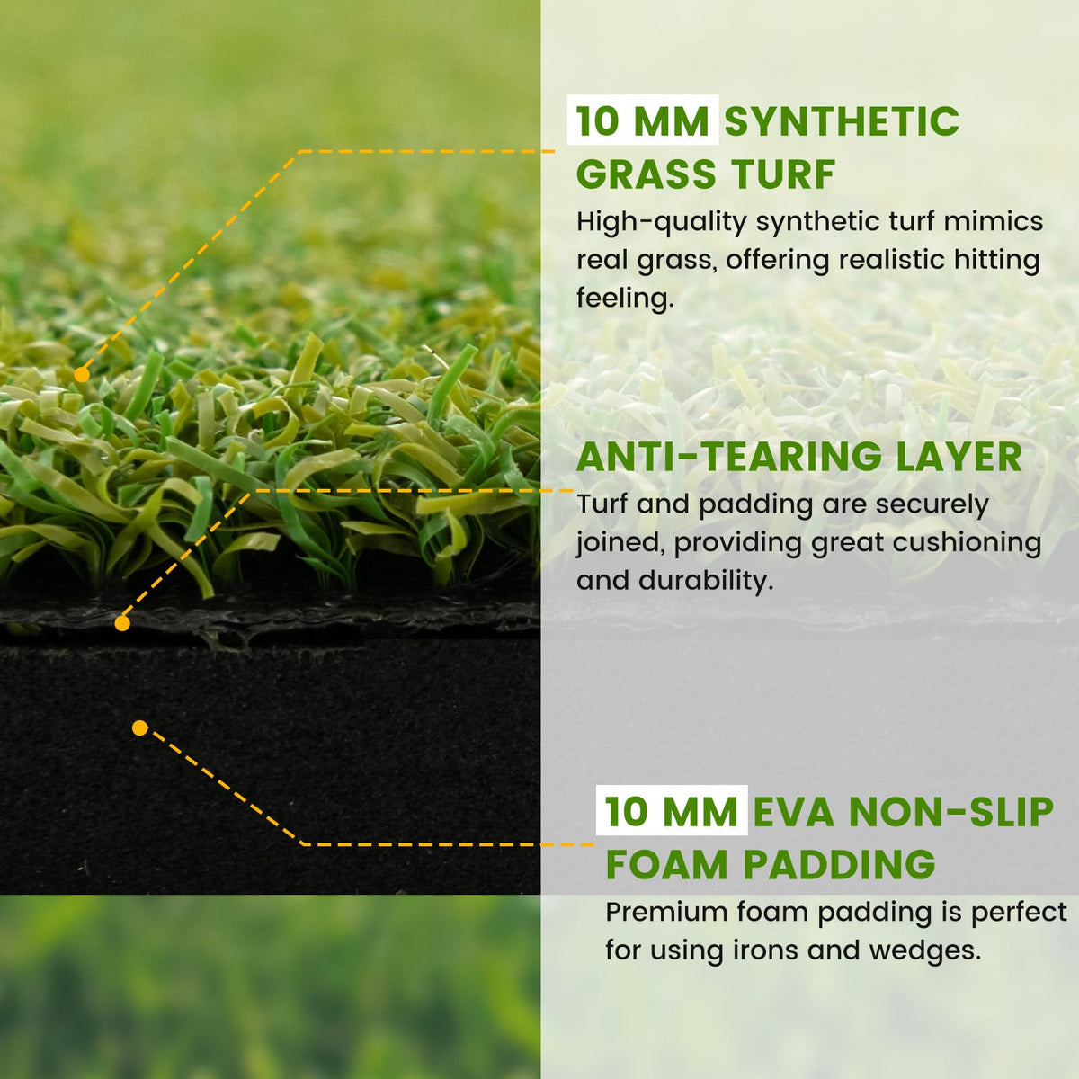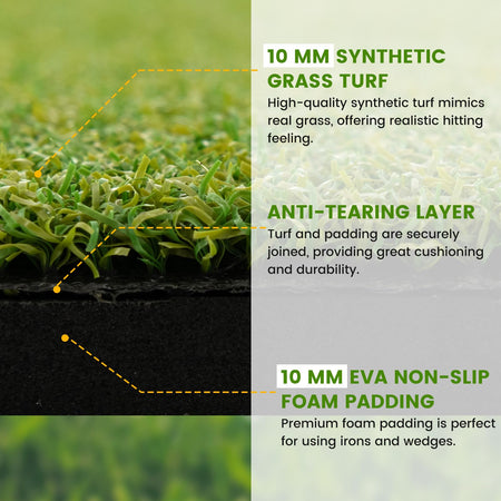 - Excellent Shock Absorption: Featuring 10 mm EVA non-slip foam padding, our golf hitting mat ensures excellent shock absorption to protect your clubs and wrists. Plus, the turf and padding are securely joined, providing great cushioning and durability.