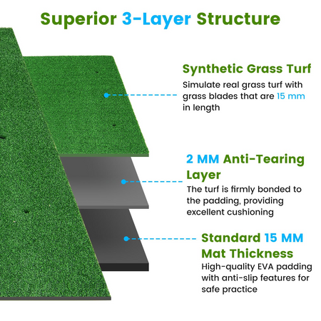 - ⛳【Excellent Shock Absorption】⛳Featuring 15 mm EVA non-slip foam padding, our golf hitting mat ensures excellent shock absorption to protect your clubs and wrists. Plus, the turf and padding are securely joined, providing great cushioning and durability.