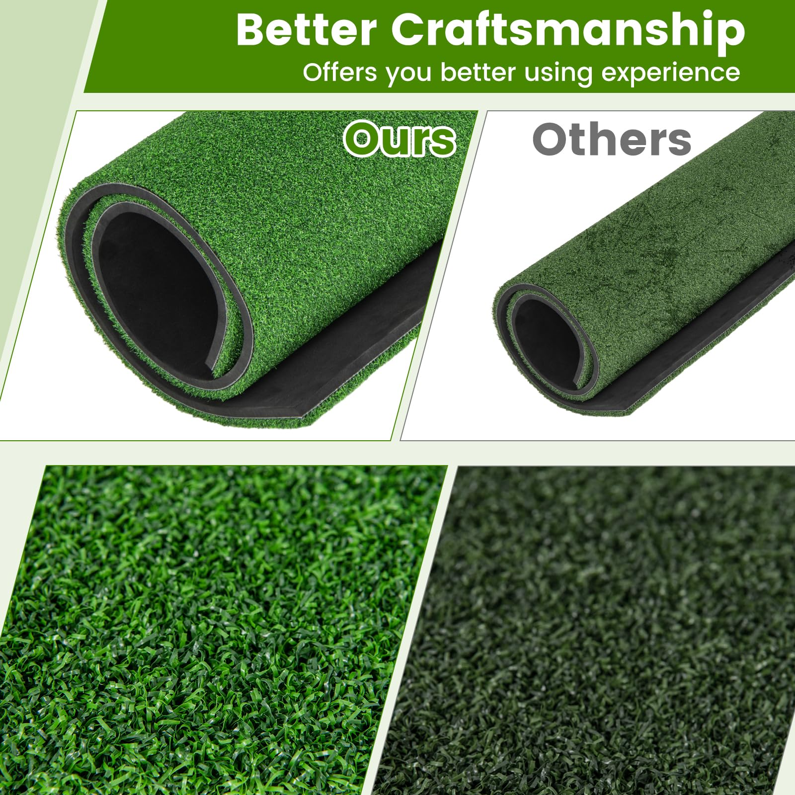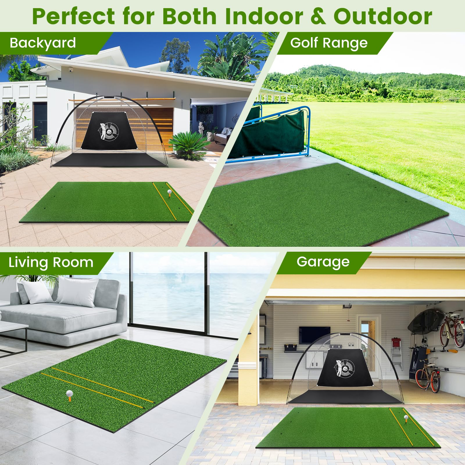√ High-quality synthetic turf mimics real grass, offering realistic hitting feeling