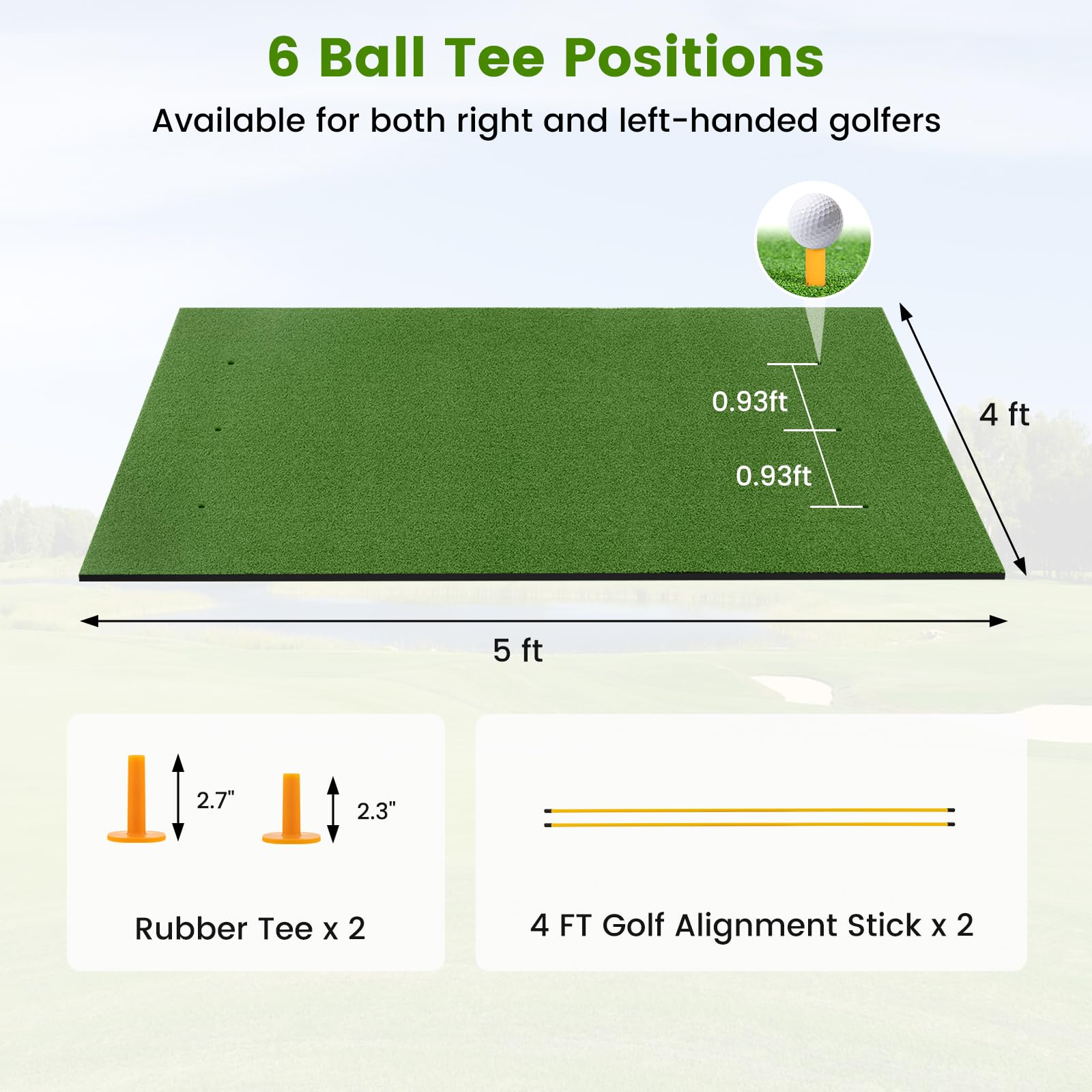 - ⛳【6 Ball Tee Positions】⛳The 5 ft x 4 ft golf training turf mat provides plenty of room for practice and includes 6 ball tee positions to cater to both right and left-handed golfers. The included rubber tees also offer added convenience during practice sessions (Ball tee can be installed).