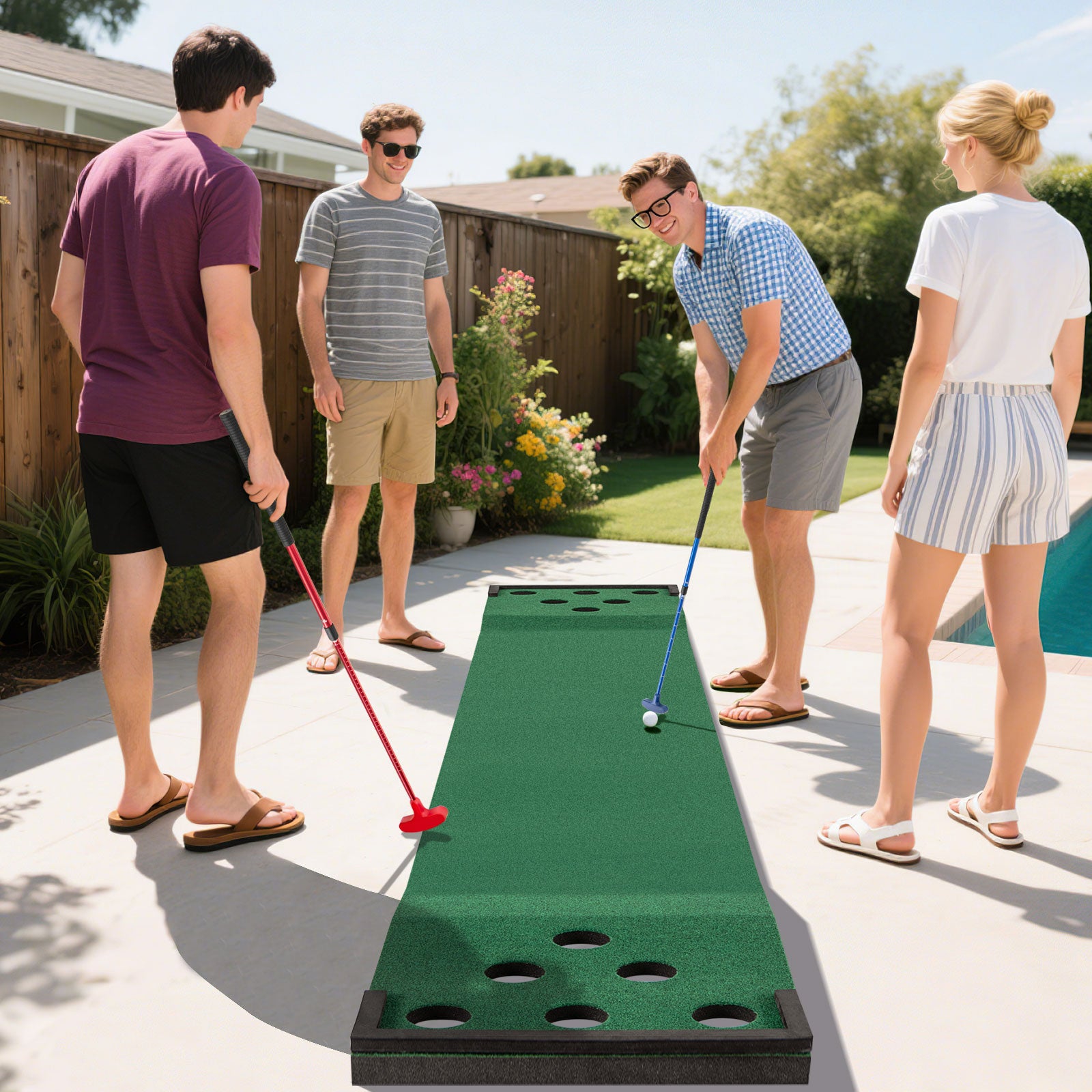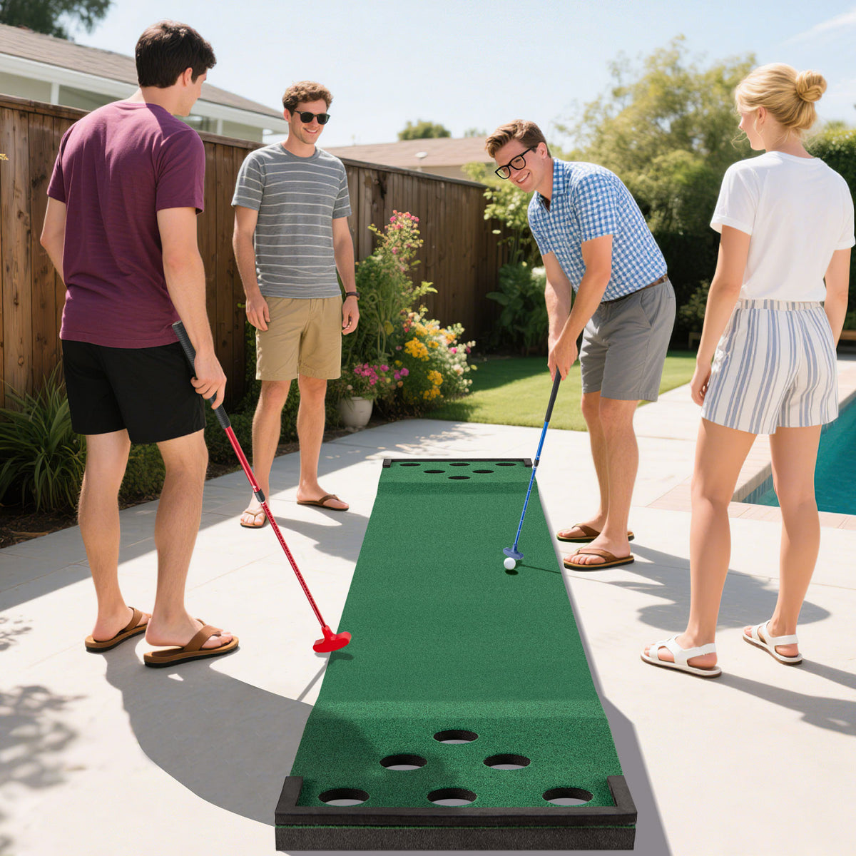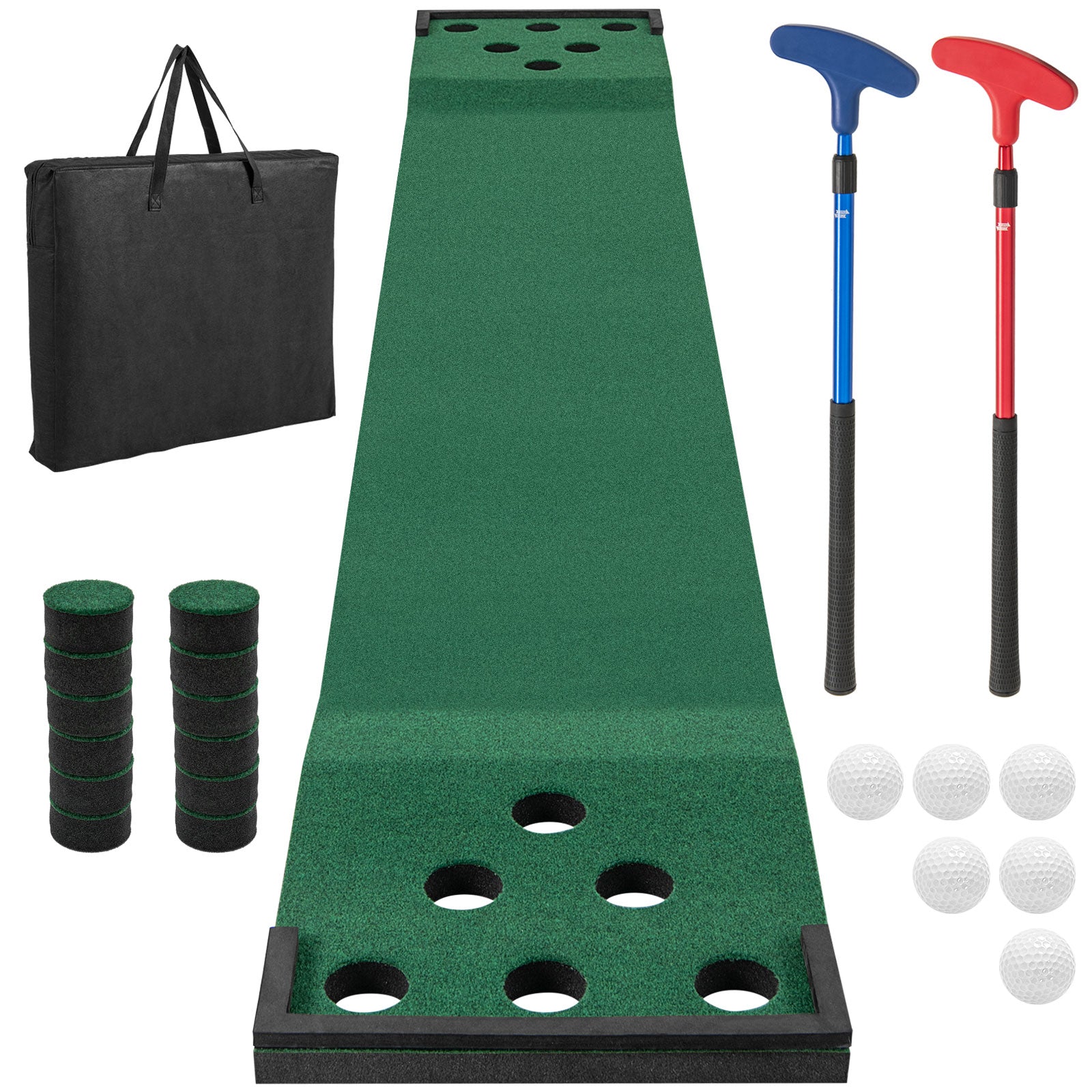 - What You Get: This complete golf putting game set includes a putting mat, 2 putters, 12 hole covers, 6 golf balls, and a carry bag. All you need to start a game is included, no additional purchases necessary.