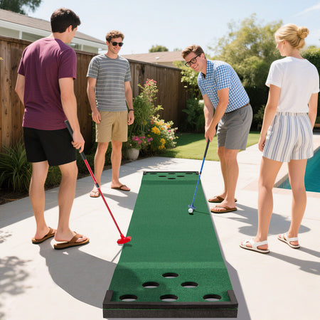 With this versatile golf game set, you can enjoy golf putting games with your family, friends, colleagues, and more. The set includes a putting mat, 2 adjustable putters, 12 hole covers, 6 golf balls, and a carry bag, ideal for all players. Its anti-slip bottom ensures stability during play. The portable design makes it perfect for parties, camping, picnics, or family nights. A fun game set for all ages and occasions!