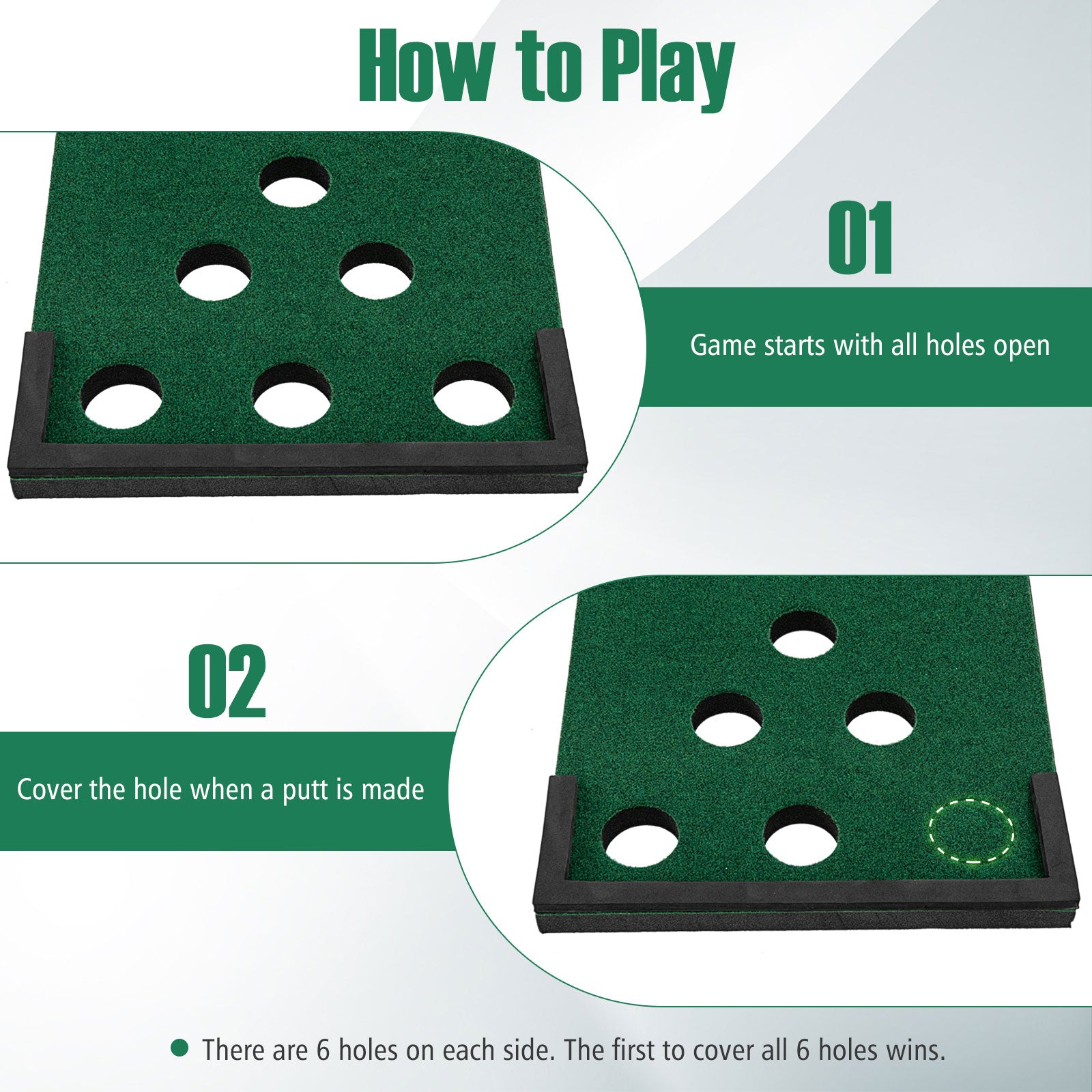 - Funny Golf Pong Game: This 2-2 pong style gameplay heats up quickly. There are 6 holes on each side of the putting green mat. The first to cover all 6 holes wins. The game starts with all holes open, and the players cover the hole when a putt is made.