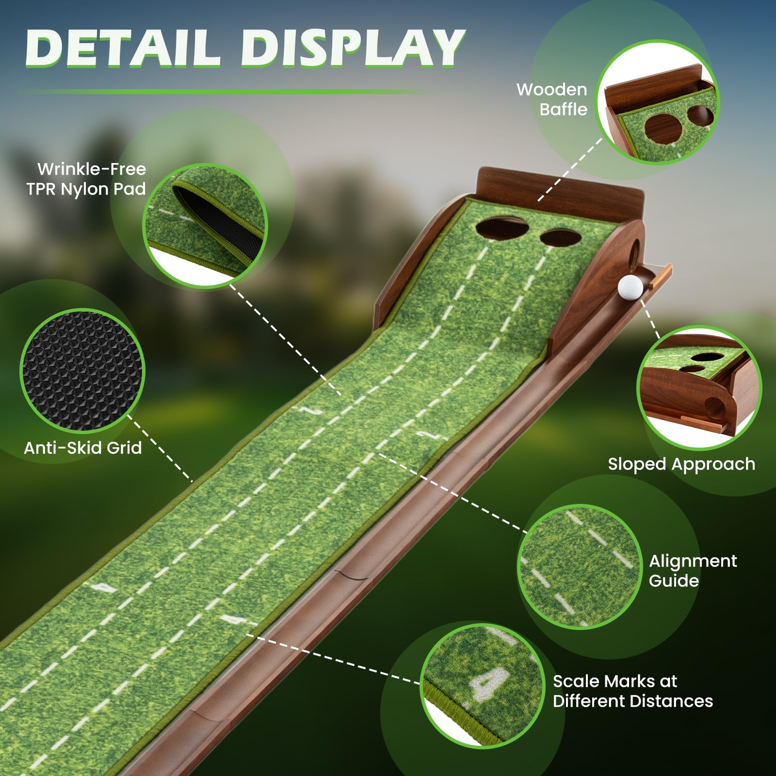 - Premium Materials: Crafted from wrinkle-free TPR nylon, the smooth surface of this putting mat simulates a realistic putting green experience, while the alignment guide aids in improving your putting accuracy with each stroke.