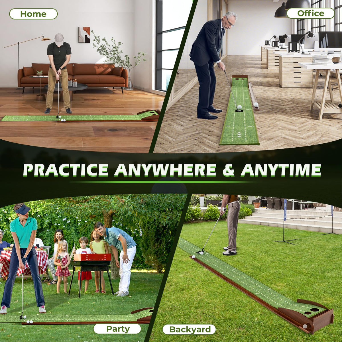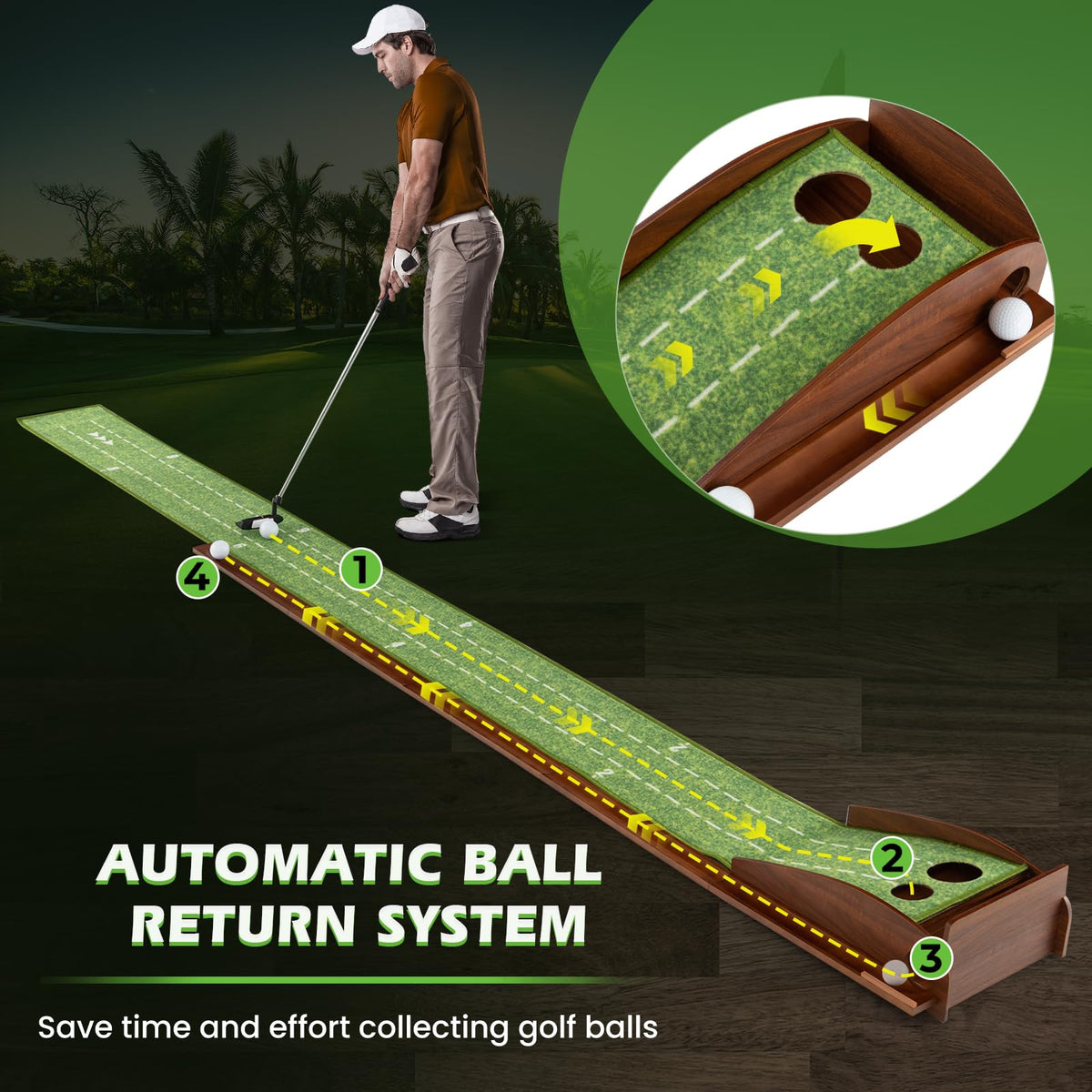 - Automatic Ball Return: The golf putting mat features an automatic ball return system, saving time and effort by eliminating the need to retrieve balls after every putt, allowing you to focus on improving your strokes.