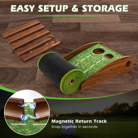 - Easy Setup & Storage: Lightweight and easily rollable for storage or transport, this golf putting green is suitable for indoor or outdoor use, making it ideal for home, office, backyard, and more. The magnetic return track allows quick assembly or disassembly in seconds.
