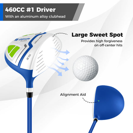 - Premium Construction: All woods are quipped with aluminum alloy clubheads, lightweight graphite shafts, and an alignment aid for precise shots. The 460cc driver with a large sweet spot ensures high forgiveness on off-center hits, enhancing your confidence with every swing.