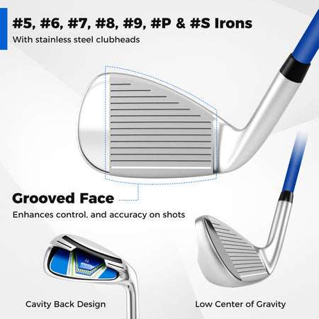 - Engineered for Control & Distance: The irons are meticulously built with a cavity back design for a low center of gravity, which enhances forgiveness and stability. The grooved surface on each iron enhances control, and accuracy on shots, while the resilient graphite shafts offer greater speed and flexibility.
