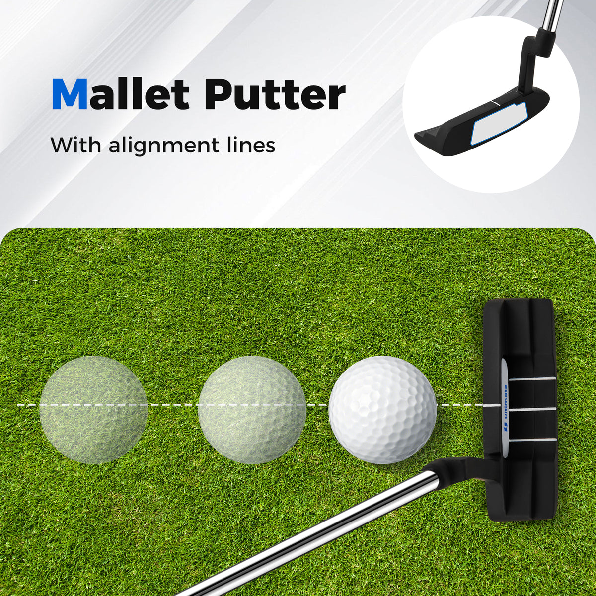 - Putts with Confidence: The mallet putter is equipped with a zinc alloy clubhead, sturdy steel shaft, and anti-slip handgrips. The alignment lines promote better aim and a smooth stroke, helping reduce your scores and making putting more consistent and predictable.